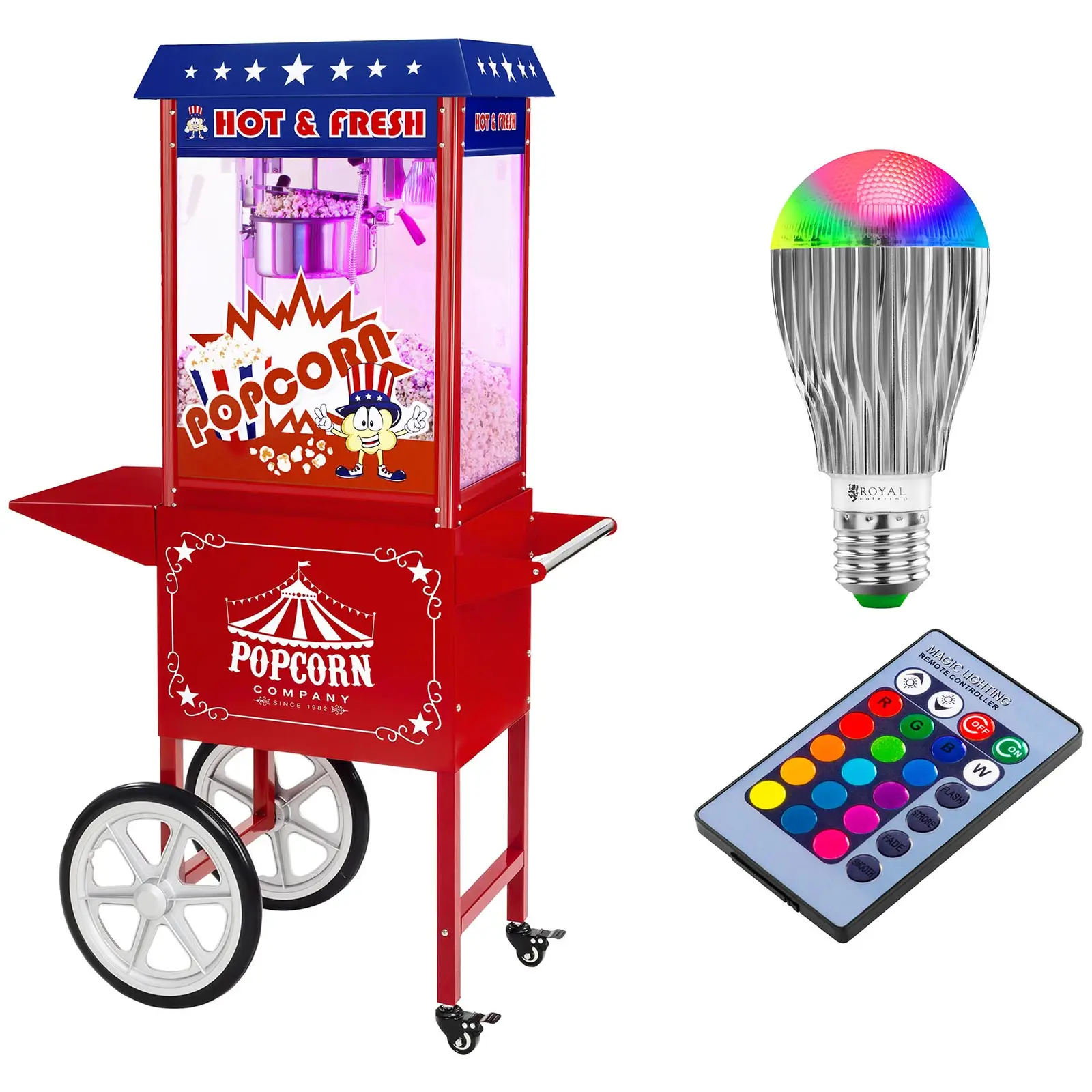 A RCPW-16.1 popcorn készítő gép, kocsival és LED világítással a Royal Cateringtől, kifejezetten a professzionális vendéglátáshoz lett kifejlesztve és kétségtelenül szemet gyönyörködtető. Nemcsak a gép és a kocsi vonzó retro kialakításával, hanem a fülkével, a fűtött és megvilágított kamrával, a keverő rendszerrel és az automatikus termosztáttal is elkápráztatja. Profitáljon a popcorn készítő készletből, emellett pedig tapasztalja meg a nem mindennapos popcorn készítés élményét. Továbbá a popcorn automata LED RGB világítással felszerelt. A szembetűnő világítás a gyerekeket egy vásári bódéra emlékezteti majd. Így ez a készlet nélkülözhetetlen mozikban, nagyobb eseményeken vagy magánrendezvények során.