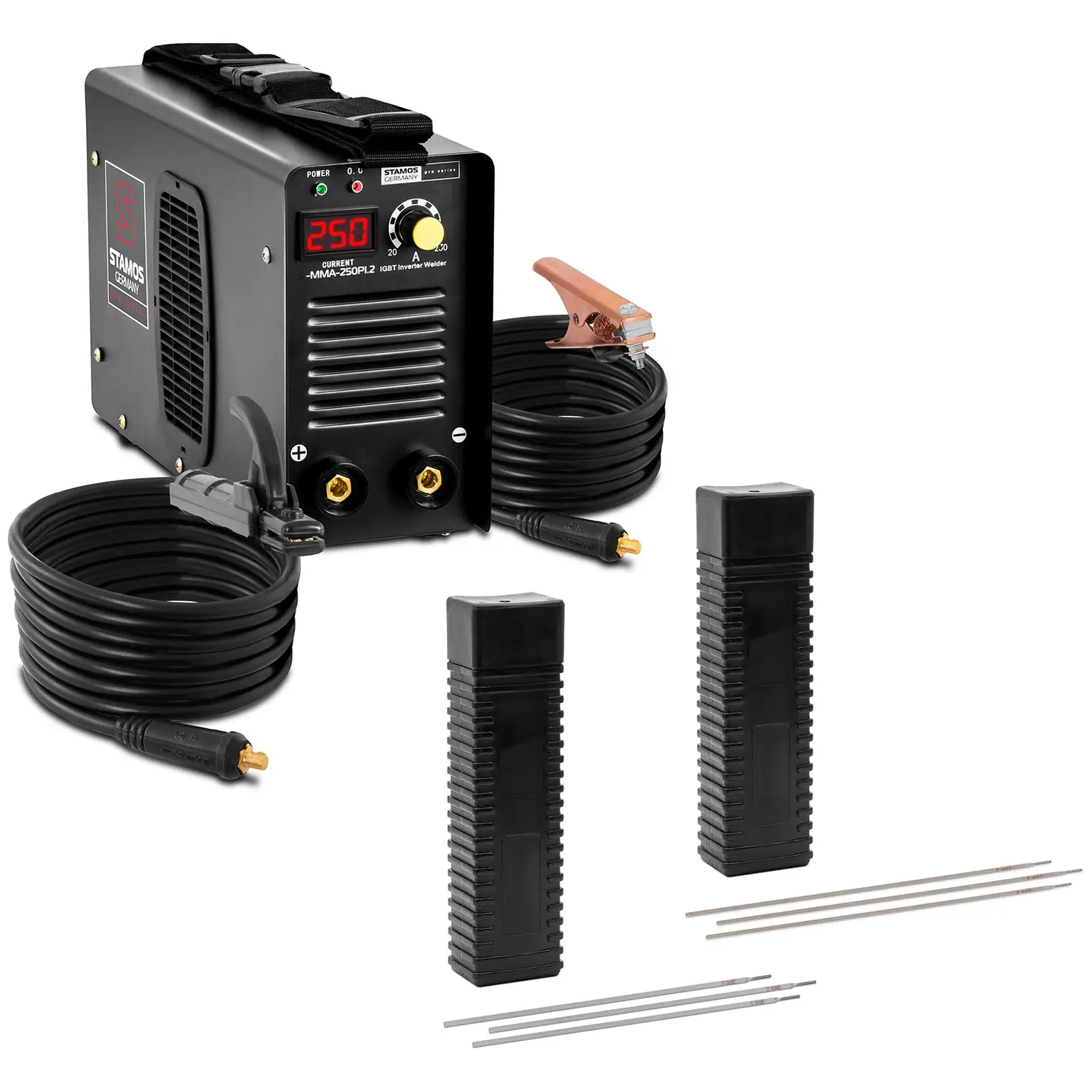 Erőteljes, biztonságos és mobil – pont, mint amilyennek egy modern hegesztőgépnek lennie kell. A STAMOS Germany S-MMA-250PI.2 hegesztőgépe max. 250 A-val működik. És ha kültéren dolgozik? Az extra hosszú, 8 m-es kábelnek köszönhetően mindig rugalmasan dolgozhat, akár létrán, akár nagyobb tárgyak hegesztése során. Mind az MMA, mind a földelő kábel lényegesen hosszabbak, mint a hagyományos hegesztőkábelek. A Stamos Welding Group hegesztőelektródáival Ön a lehető legjobb helyzetben van, ha nem rozsdásodó acélt szeretne hegeszteni. Az elektródák mérete 2,5 x 300 mm, és 5 kg-os kiszerelésben vannak. Univerzális elektródákat keres? A rutil-cellulóz bevonatú elektródákkal hatékonyan hegeszthet uszályokat, tartálykonténereket és karosszériákat. A hegesztőelektródák 2,5 x 350 mm méretűek és 5 kg-os kiszerelésben érkeznek.
