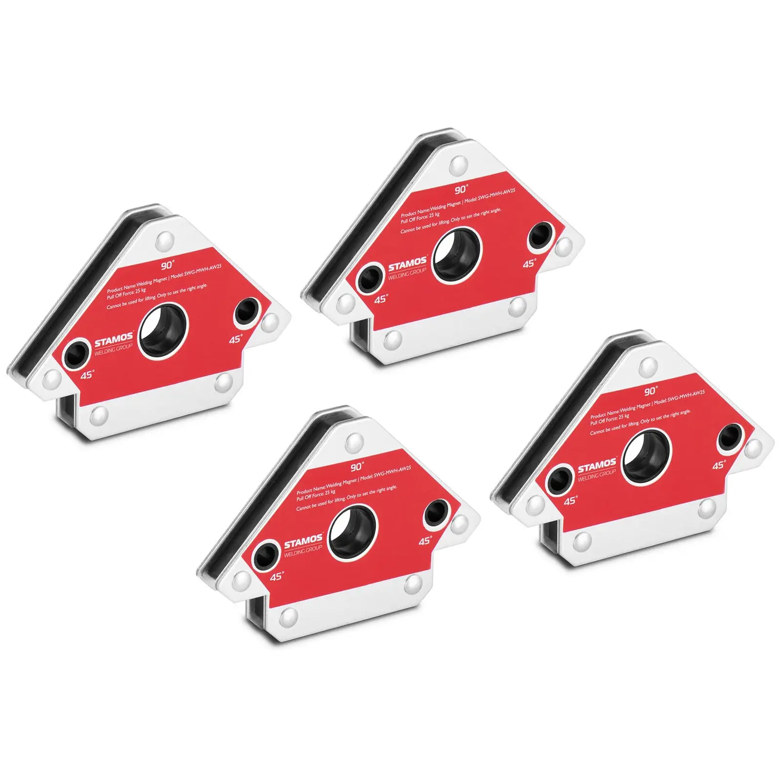 A hegesztőmágnes nyíl alakú kialakítása lehetővé teszi a multifunkcionális alkalmazást különböző pozíciókban. Helyezze a hegesztőmágneseket 45, 90 és 135°-os pozícióba. A mágneses szögbeállító rugalmas megoldást kínál a munkadarabok optimális elhelyezésére, az Ön elképzeléseinek megfelelően.